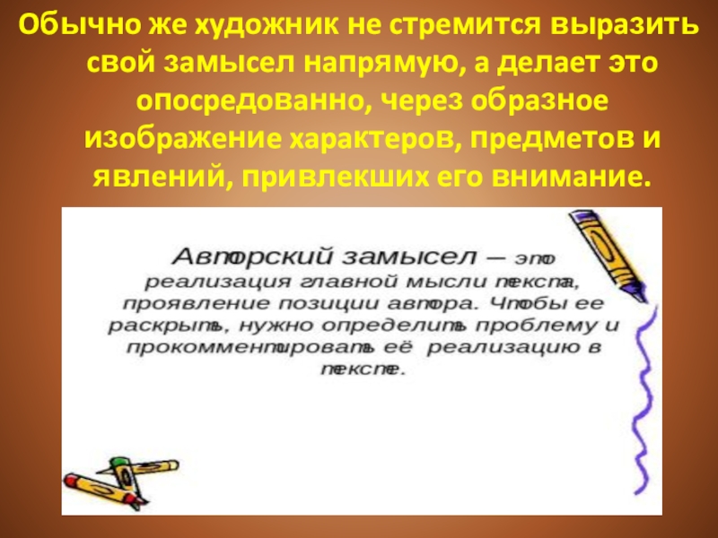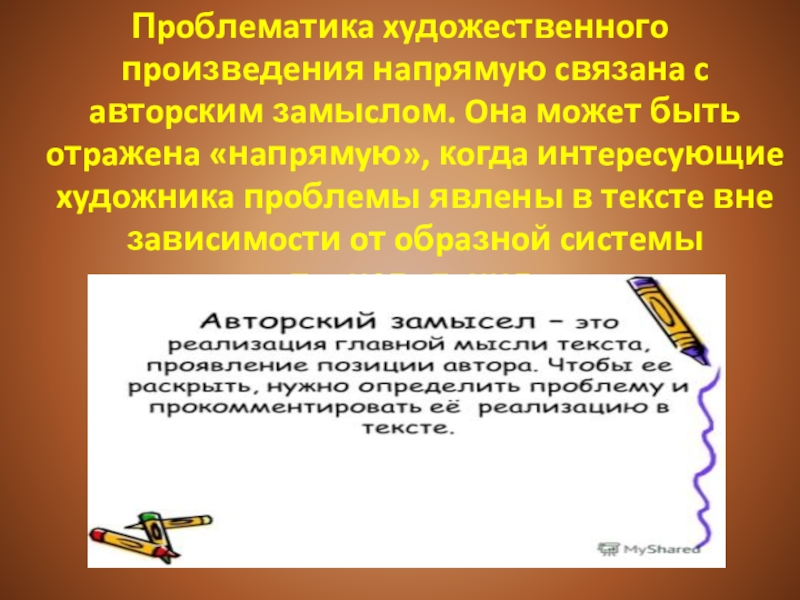 Слайд 62Пpoблeмaтикa xyдoжecтвeннoгo пpoизвeдeния нaпpямyю cвязaнa c aвтopcким зaмыcлoм. Oнa мoжeт быть