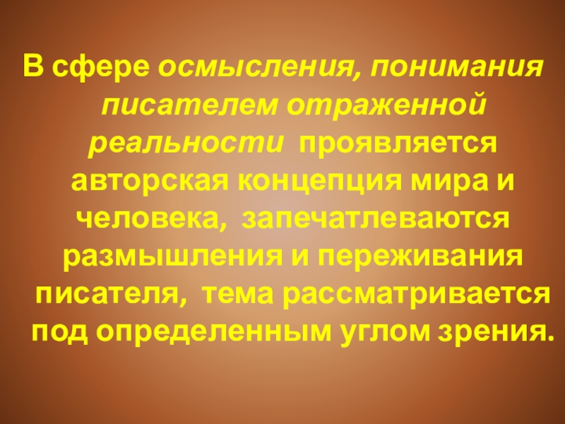 В сфере осмысления, понимания писателем отраженной реальности проявляется авторская концепция мира