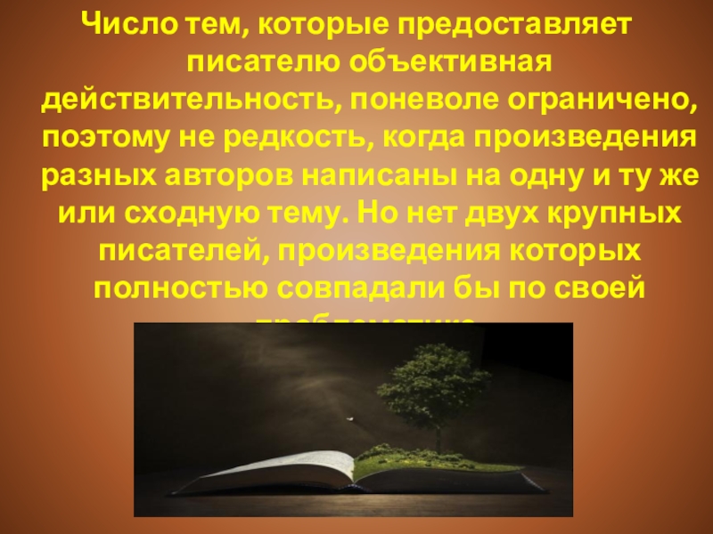 Слайд 34Число тем, которые предоставляет писателю объективная действительность, поневоле ограничено, поэтому не
