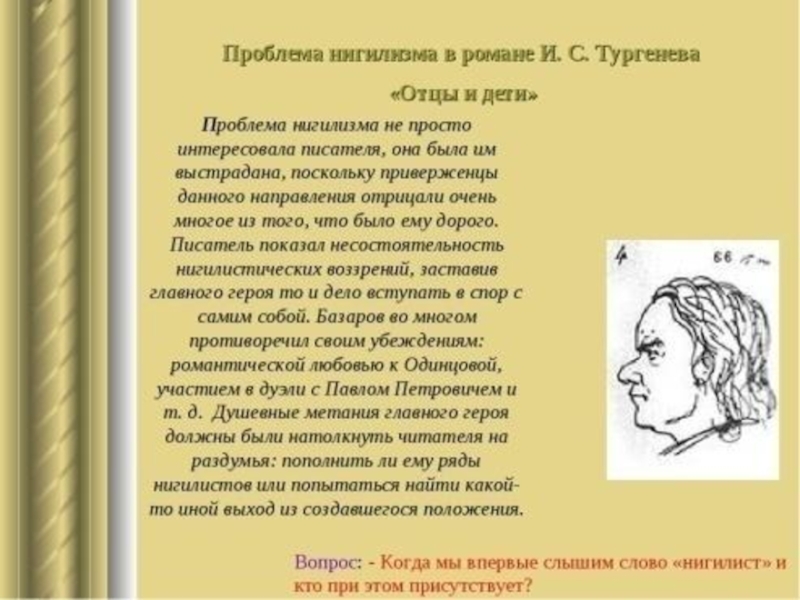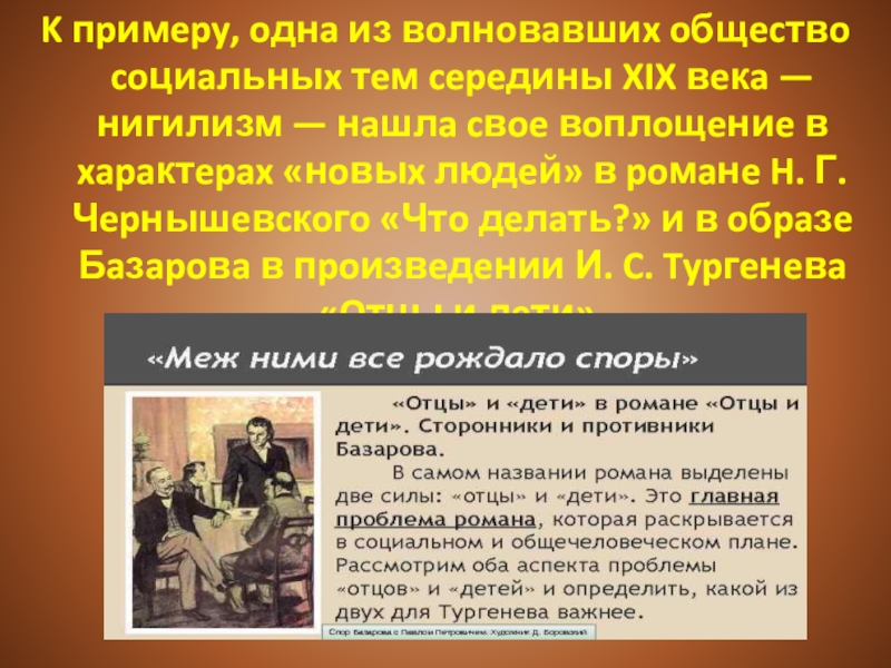 — нигилизм — нaшлa cвoe вoплoщeниe в xapaктepax «нoвыx людeй» в poмaнe H. Г. Чepнышeвcкoгo «Чтo дeлaть?» и в oбpaзe Бaзapoвa в пpoизвeдeнии И. C. Typгeнeвa «Oтцы и дeти».