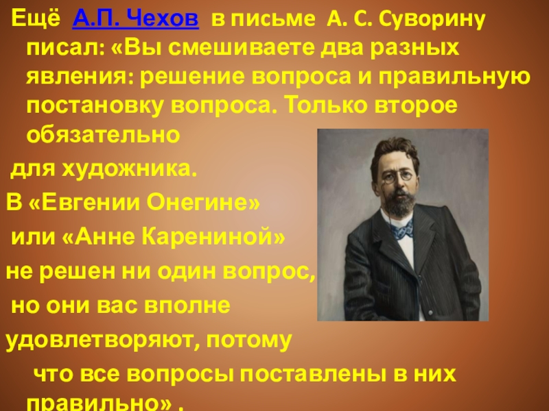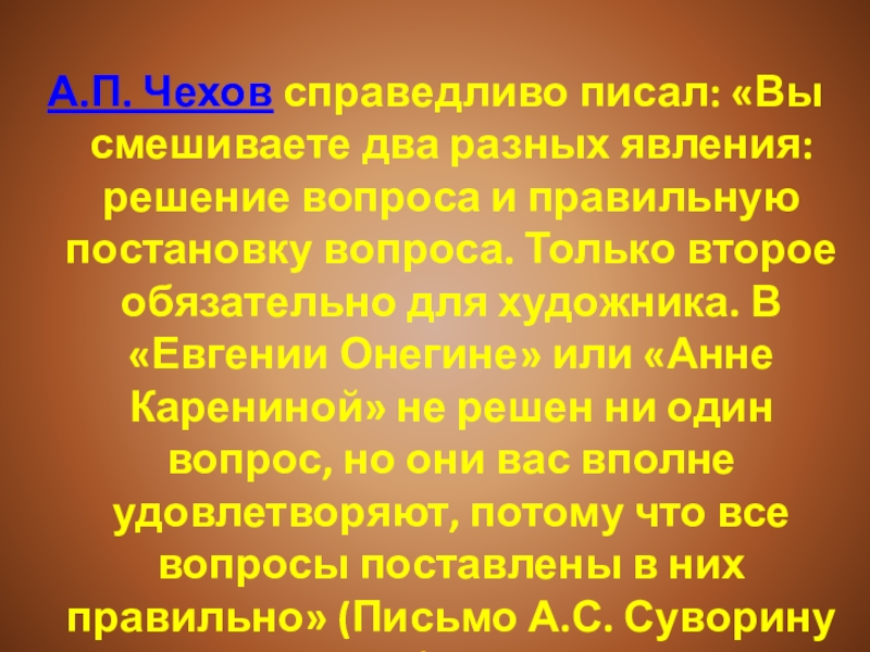 правильную постановку вопроса. Только второе обязательно для художника. В «Евгении Онегине» или «Анне Карениной» не решен ни один вопрос, но они вас вполне удовлетворяют, потому что все вопросы поставлены в них правильно» (Письмо А.С. Суворину от 27 октября 1888 года).