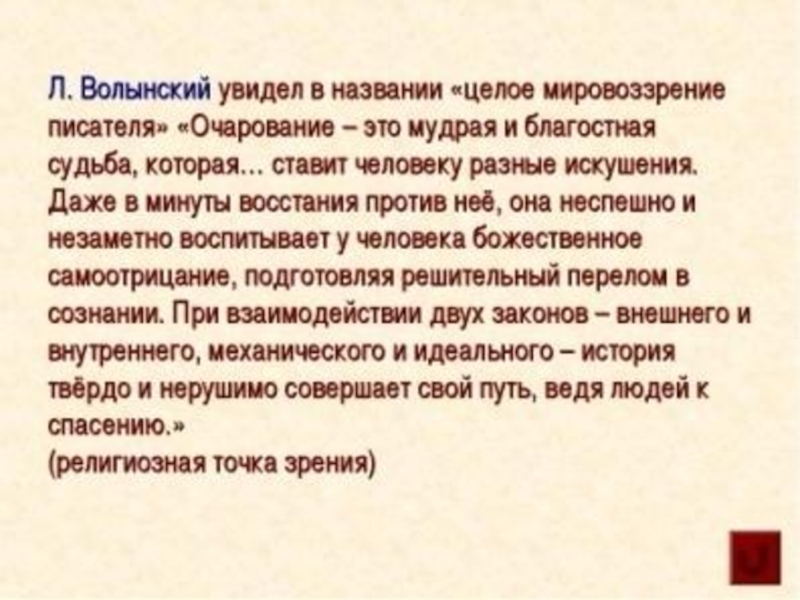 сторон жизни) – это идейное осмысление писателем тех социальных характеров, которые он изобразил в произведении. Осмысление это заключается в том, что писатель выделяет и усиливает те свойства характеров, которые он, исходя из своего идейного миросозерцания, считает наиболее существенными».