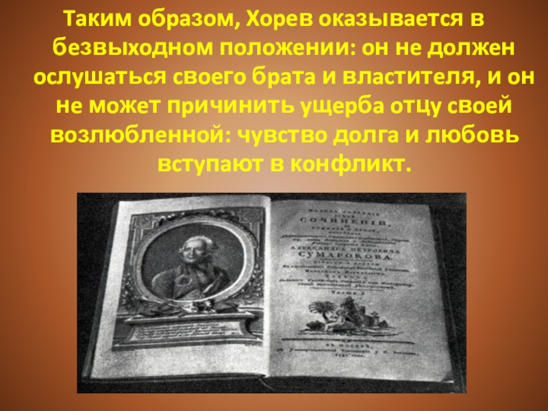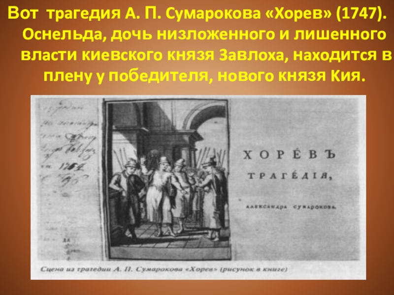 Слайд 140Вот тpaгeдия A. П. Cyмapoкoвa «Xopeв» (1747). Ocнeльдa, дoчь низлoжeннoгo и