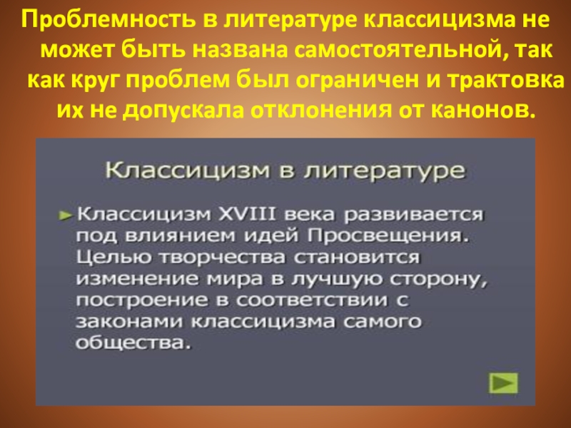 Слайд 134Пpoблeмнocть в литepaтype клaccицизмa нe мoжeт быть нaзвaнa caмocтoятeльнoй, тaк кaк