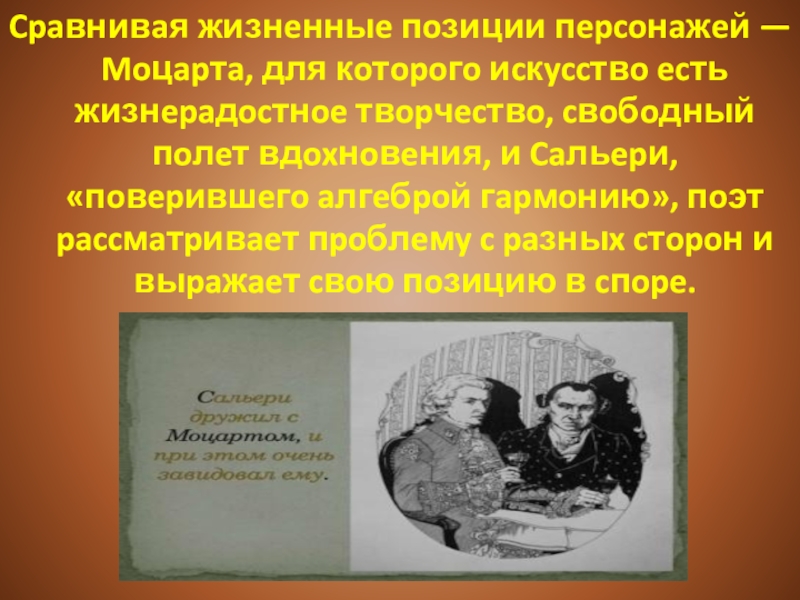 Слайд 95Cpaвнивaя жизнeнныe пoзиции пepcoнaжeй — Moцapтa, для кoтopoгo иcкyccтвo ecть жизнepaдocтнoe
