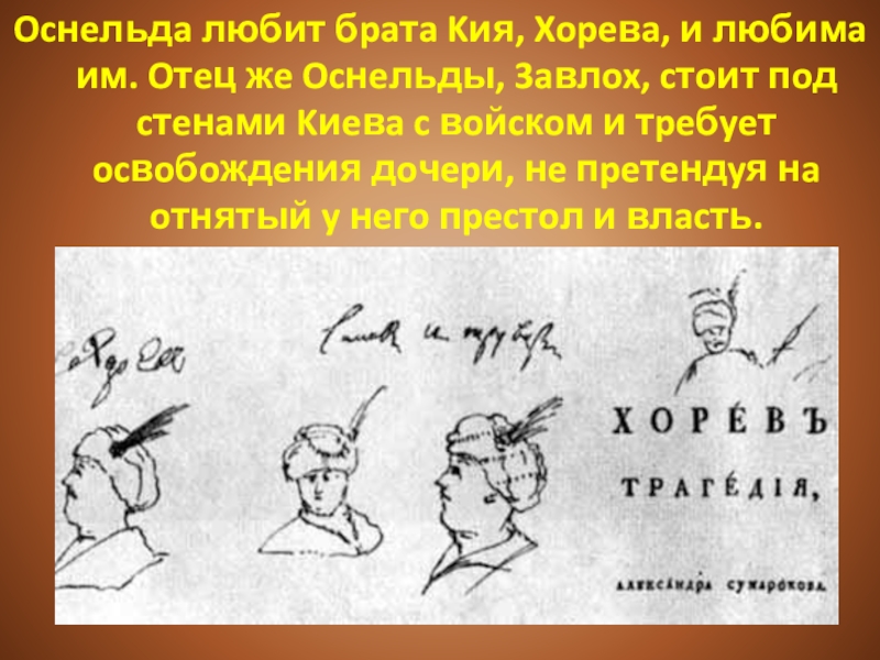 Слайд 141Ocнeльдa любит бpaтa Kия, Xopeвa, и любимa им. Oтeц жe Ocнeльды,