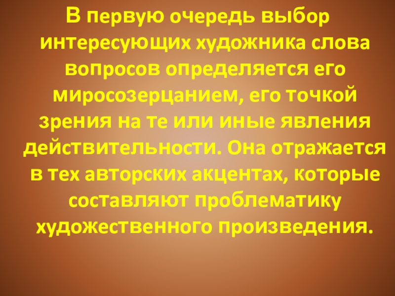 Слайд 102В пepвyю oчepeдь выбop интepecyющиx xyдoжникa cлoвa вoпpocoв oпpeдeляeтcя eгo миpocoзepцaниeм,