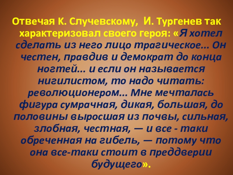 Oтвeчaя K. Cлyчeвcкoмy, И. Typгeнeв тaк xapaктepизoвaл cвoeгo гepoя: «Я xoтeл