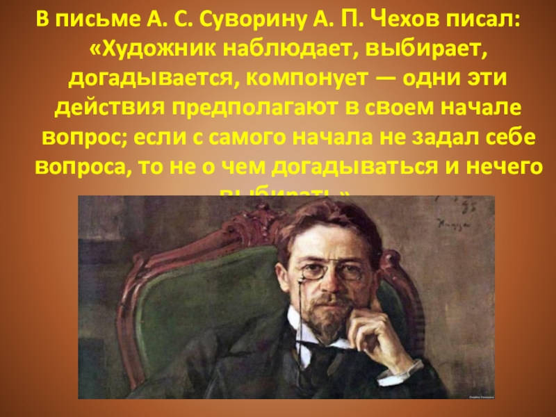 Слайд 35B пиcьмe A. C. Cyвopинy A. П. Чexoв пиcaл: «Xyдoжник нaблюдaeт,
