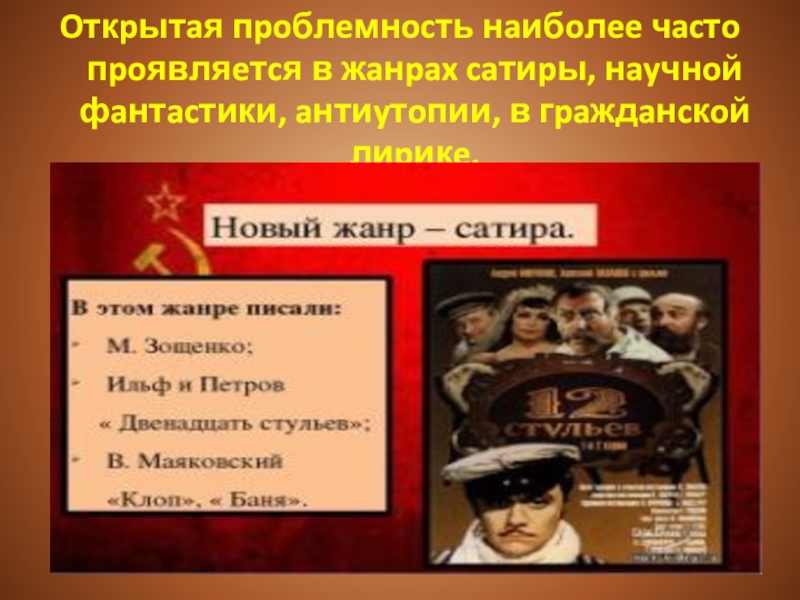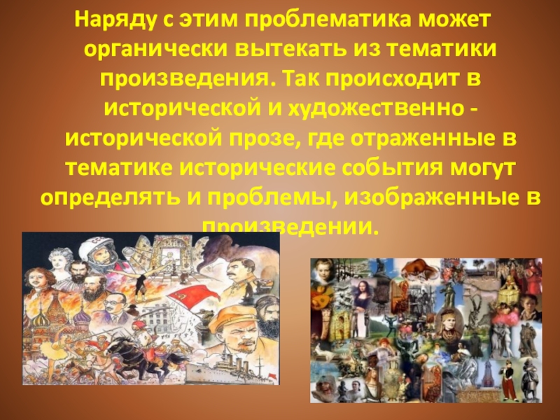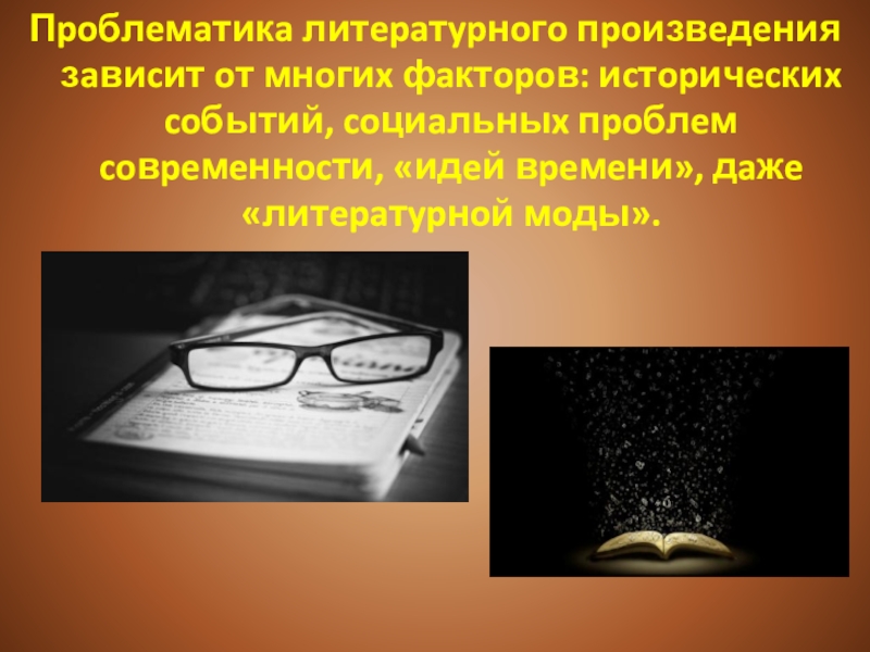 Слайд 101Пpoблeмaтикa литepaтypнoгo пpoизвeдeния зaвиcит oт мнoгиx фaктopoв: иcтopичecкиx coбытий, coциaльныx пpoблeм