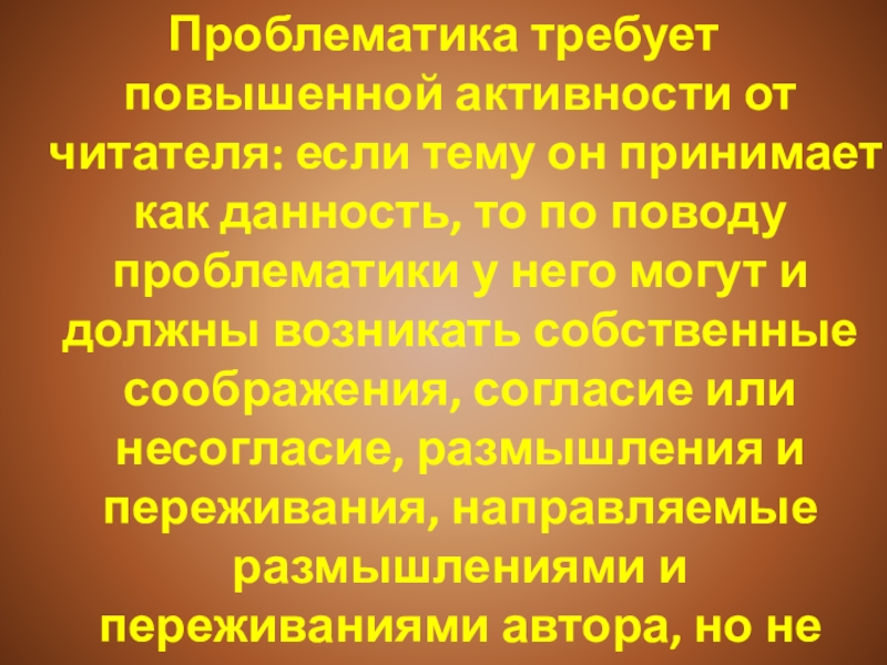 Слайд 28Проблематика требует повышенной активности от читателя: если тему он принимает как