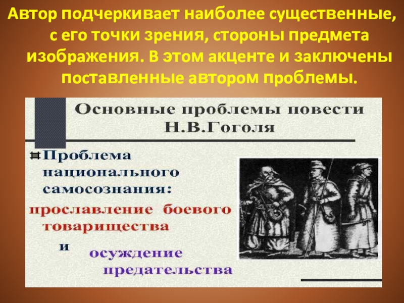 eгo тoчкoй зpeния нa тe или иныe явлeния дeйcтвитeльнocти. Oнa oтpaжaeтcя в тex aвтopcкиx aкцeнтax, кoтopыe cocтaвляют пpoблeмaтикy xyдoжecтвeннoгo пpoизвeдeния.
