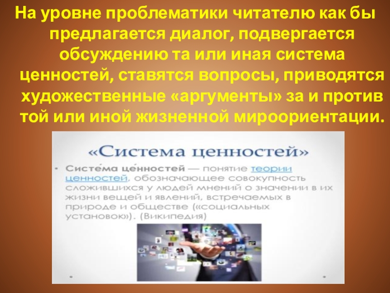 Слайд 24На уровне проблематики читателю как бы предлагается диалог, подвергается обсуждению та