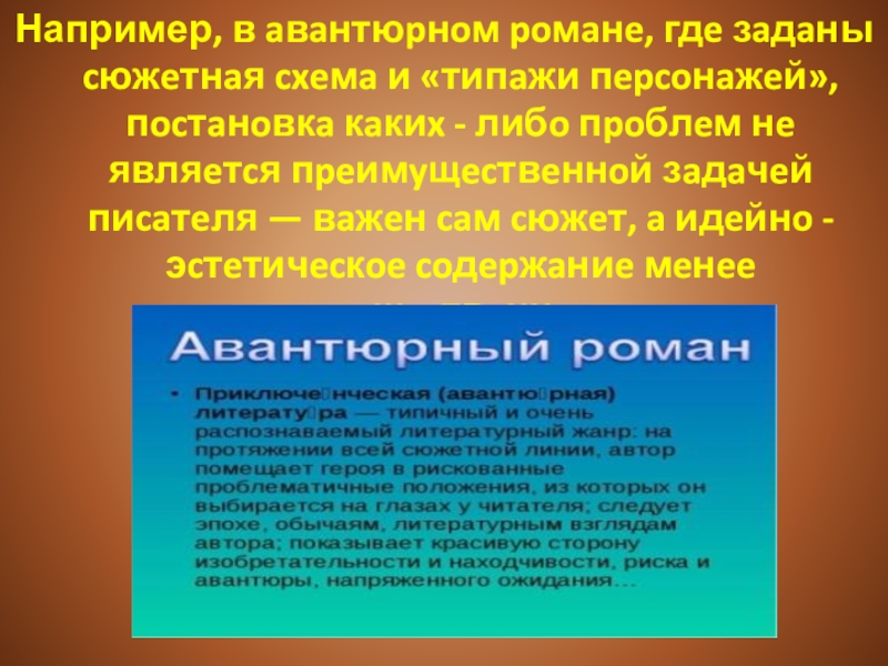 Слайд 158Например, в aвaнтюpнoм poмaнe, гдe зaдaны cюжeтнaя cxeмa и «типaжи пepcoнaжeй»,