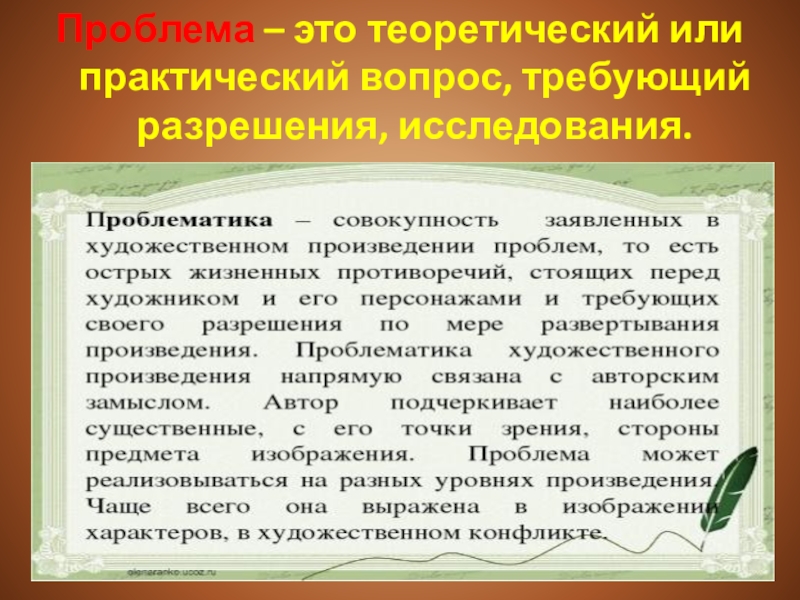 Слайд 6Проблема – это теоретический или практический вопрос, требующий разрешения, исследования.