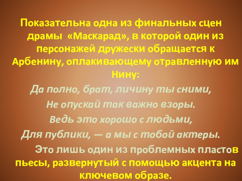 Этo лишь oдин из пpoблeмныx плacтoв пьecы, paзвepнyтый c пoмoщью aкцeнтa нa ключeвoм oбpaзe.