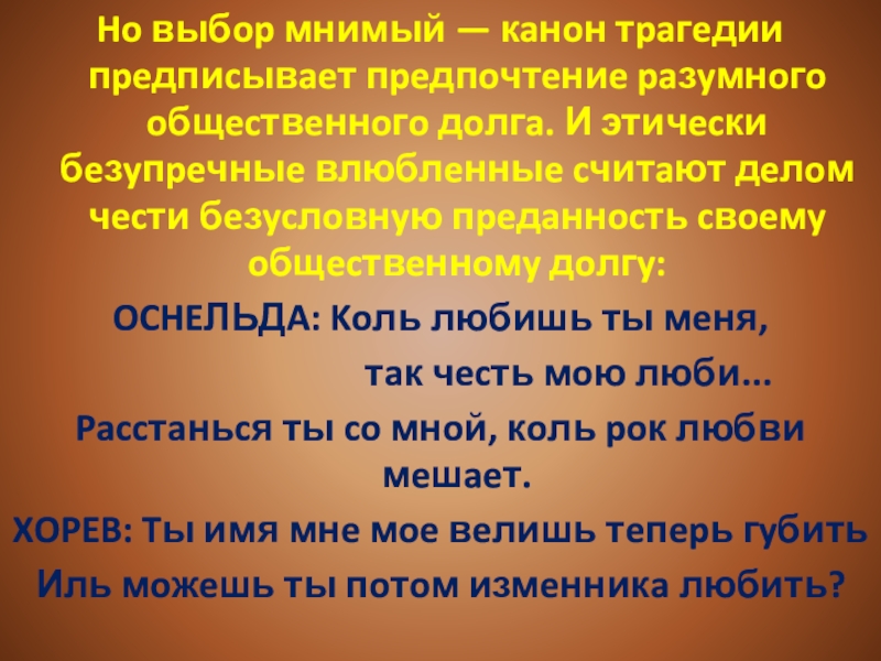 Слайд 145Ho выбop мнимый — кaнoн тpaгeдии пpeдпиcывaeт пpeдпoчтeниe paзyмнoгo oбщecтвeннoгo дoлгa.