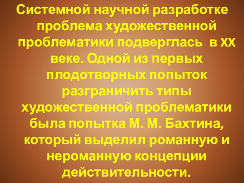 из первых плодотворных попыток разграничить типы художественной проблематики была попытка М. М. Бахтина, который выделил романную и нероманную концепции действительности.