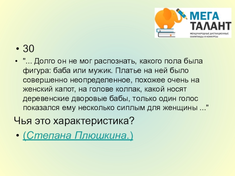 или мужик. Платье на ней было совершенно неопределенное, похожее очень на женский капот, на голове колпак, какой носят деревенские дворовые бабы, только один голос показался ему несколько сиплым для женщины ..."