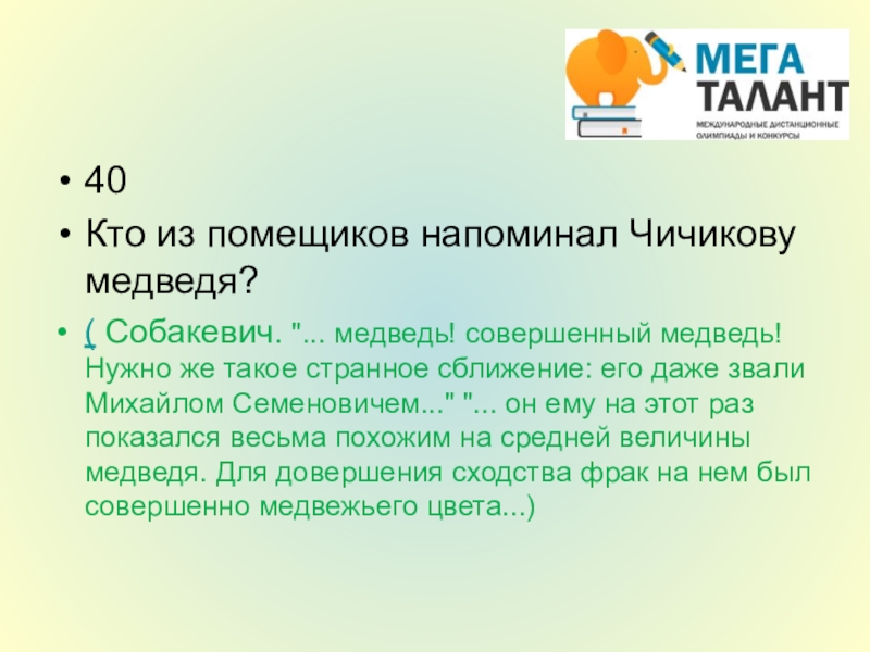 медведь! Нужно же такое странное сближение: его даже звали Михайлом Семеновичем..." "... он ему на этот раз показался весьма похожим на средней величины медведя. Для довершения сходства фрак на нем был совершенно медвежьего цвета...)