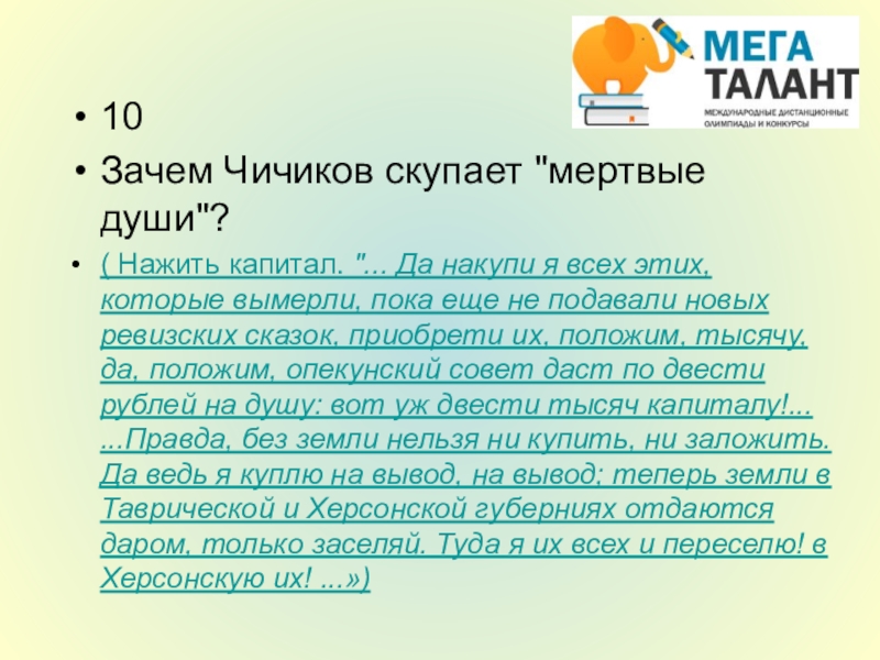 всех этих, которые вымерли, пока еще не подавали новых ревизских сказок, приобрети их, положим, тысячу, да, положим, опекунский совет даст по двести рублей на душу: вот уж двести тысяч капиталу!... ...Правда, без земли нельзя ни купить, ни заложить. Да ведь я куплю на вывод, на вывод; теперь земли в Таврической и Херсонской губерниях отдаются даром, только заселяй. Туда я их всех и переселю! в Херсонскую их! ...»)
