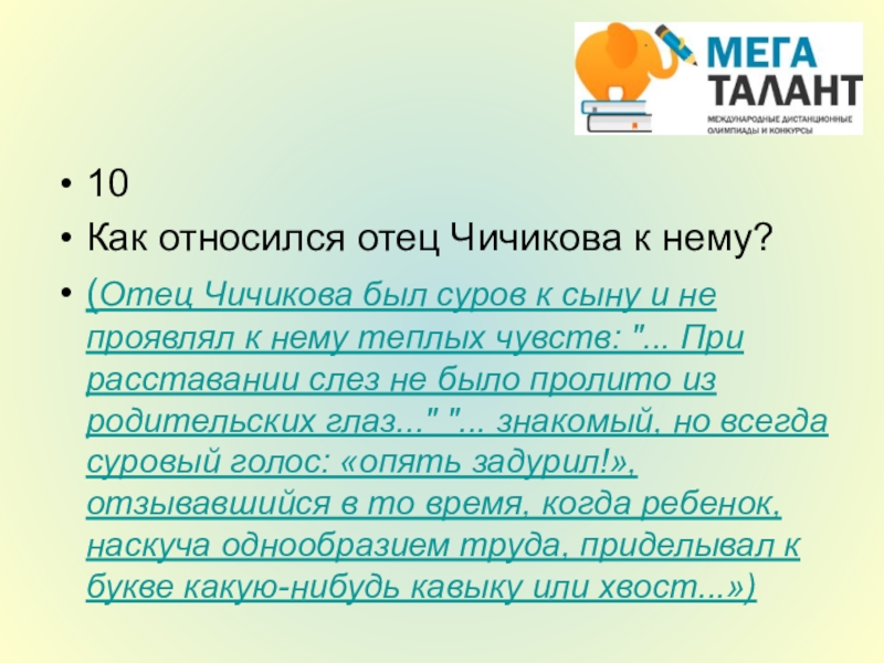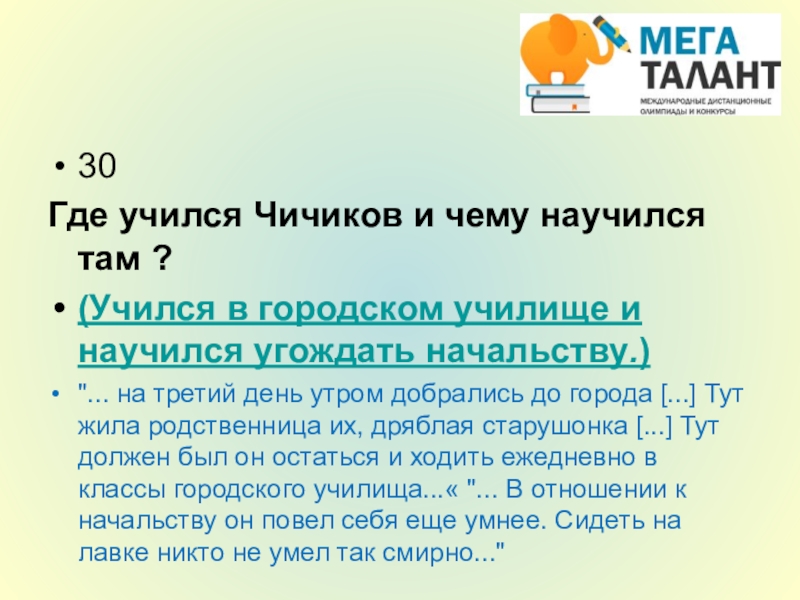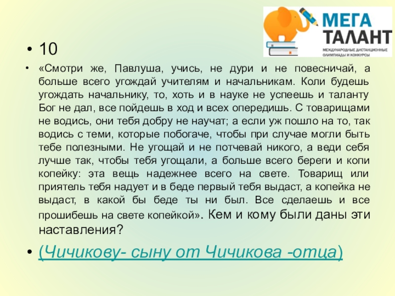 всего угождай учителям и начальникам. Коли будешь угождать начальнику, то, хоть и в науке не успеешь и таланту Бог не дал, все пойдешь в ход и всех опередишь. С товарищами не водись, они тебя добру не научат; а если уж пошло на то, так водись с теми, которые побогаче, чтобы при случае могли быть тебе полезными. Не угощай и не потчевай никого, а веди себя лучше так, чтобы тебя угощали, а больше всего береги и копи копейку: эта вещь надежнее всего на свете. Товарищ или приятель тебя надует и в беде первый тебя выдаст, а копейка не выдаст, в какой бы беде ты ни был. Все сделаешь и все прошибешь на свете копейкой». Кем и кому были даны эти наставления?