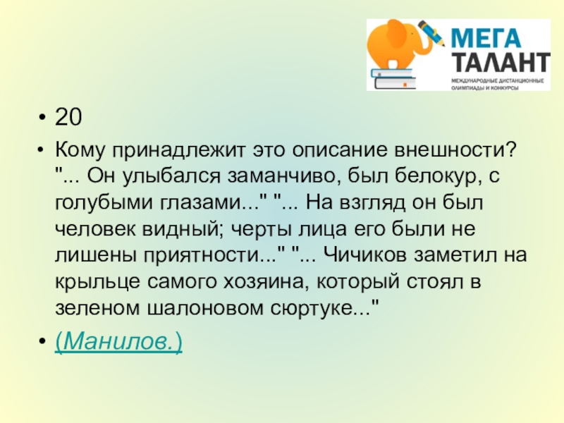 с голубыми глазами..." "... На взгляд он был человек видный; черты лица его были не лишены приятности..." "... Чичиков заметил на крыльце самого хозяина, который стоял в зеленом шалоновом сюртуке..."