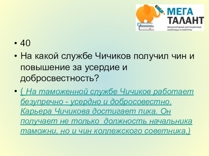 ( На таможенной службе Чичиков работает безупречно - усердно и добросовестно. Карьера Чичикова достигает пика. Он получает не только должность начальника таможни, но и чин коллежского советника.)