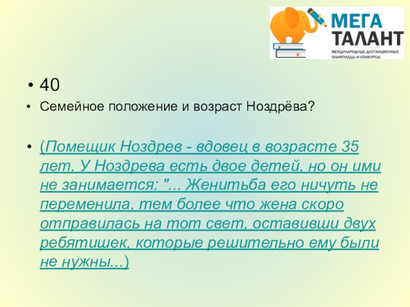 35 лет. У Ноздрева есть двое детей, но он ими не занимается: "... Женитьба его ничуть не переменила, тем более что жена скоро отправилась на тот свет, оставивши двух ребятишек, которые решительно ему были не нужны...)