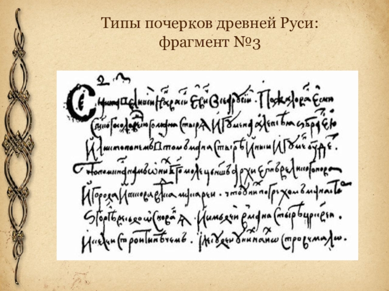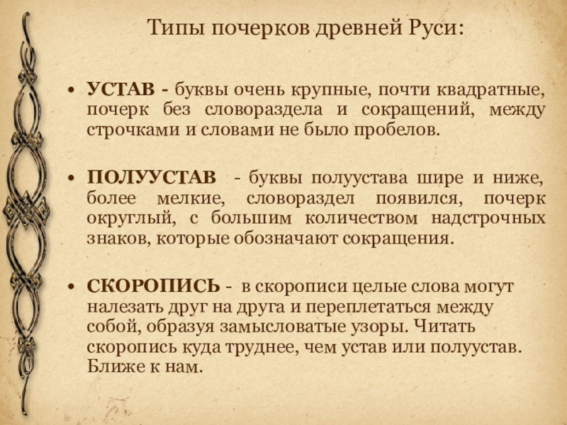 СКОРОПИСЬ - в скорописи целые слова могут налезать друг на друга и переплетаться между собой, образуя замысловатые узоры. Читать скоропись куда труднее, чем устав или полуустав. Ближе к нам.