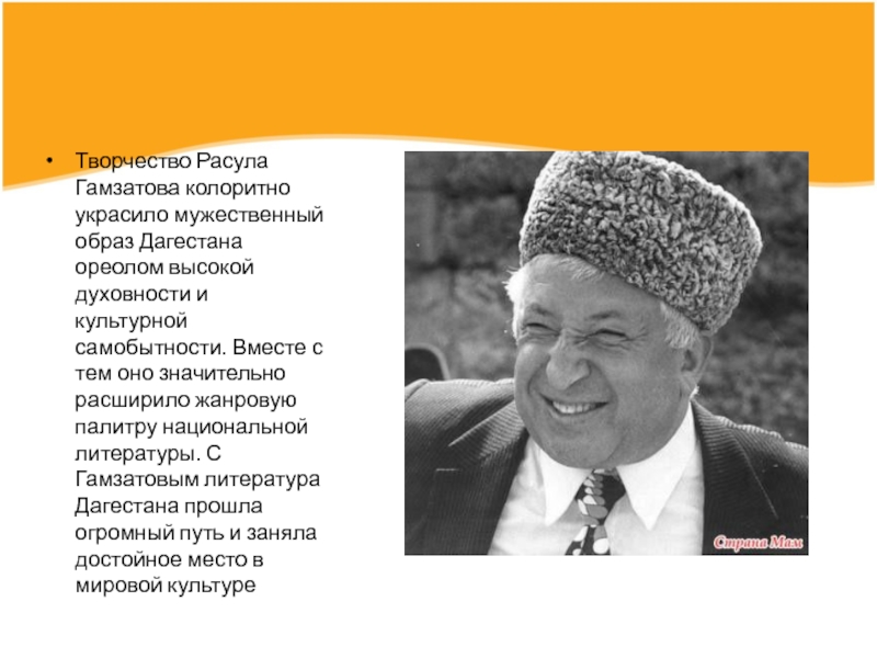 Слайд 9Творчество Расула Гамзатова колоритно украсило мужественный образ Дагестана ореолом высокой духовности