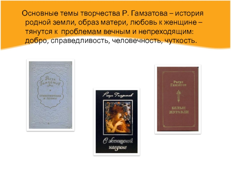 Слайд 4 Основные темы творчества Р. Гамзатова – история родной земли,