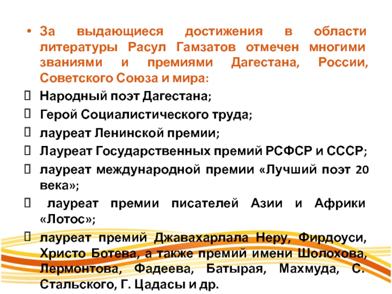 Слайд 12За выдающиеся достижения в области литературы Расул Гамзатов отмечен многими званиями