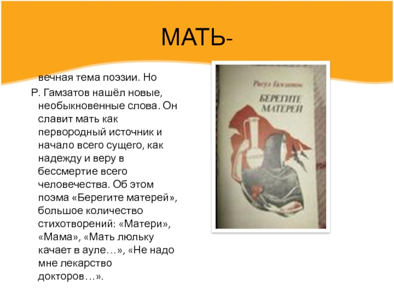 нашёл новые, необыкновенные слова. Он славит мать как первородный источник и начало всего сущего, как надежду и веру в бессмертие всего человечества. Об этом поэма «Берегите матерей», большое количество стихотворений: «Матери», «Мама», «Мать люльку качает в ауле…», «Не надо мне лекарство докторов…».