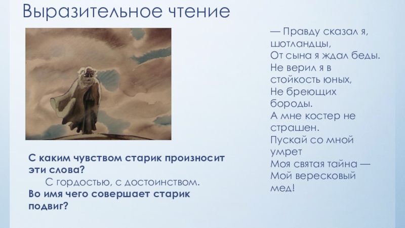 С гордостью, с достоинством. Во имя чего совершает старик подвиг?