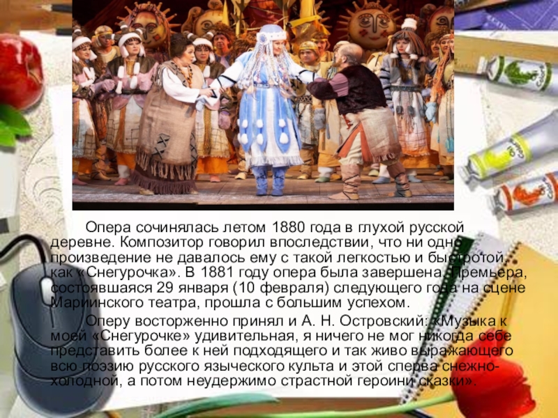 впоследствии, что ни одно произведение не давалось ему с такой легкостью и быстротой, как «Снегурочка». В 1881 году опера была завершена. Премьера, состоявшаяся 29 января (10 февраля) следующего года на сцене Мариинского театра, прошла с большим успехом.