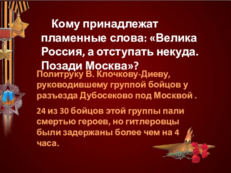 Политруку В. Клочкову-Диеву, руководившему группой бойцов у разъезда Дубосеково под Москвой .