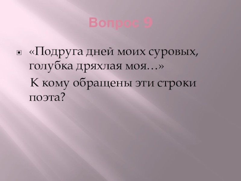Вопрос 9«Подруга дней моих суровых, голубка дряхлая моя…»   К кому обращены эти строки поэта?