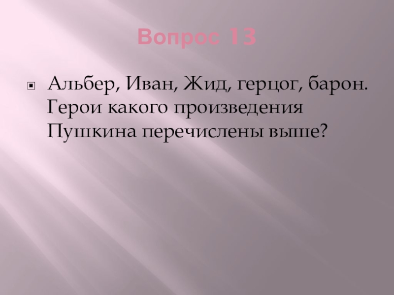 Вопрос 13Альбер, Иван, Жид, герцог, барон. Герои какого произведения Пушкина перечислены выше?