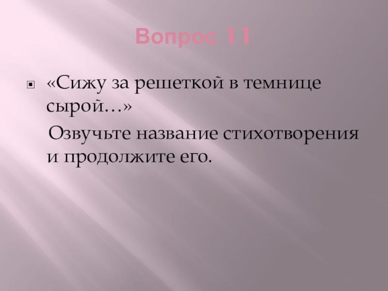 Вопрос 11«Сижу за решеткой в темнице сырой…»   Озвучьте название стихотворения и продолжите его.