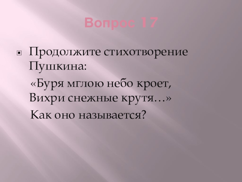 Вопрос 17Продолжите стихотворение Пушкина:  «Буря мглою небо кроет, Вихри снежные крутя…»  Как оно называется?
