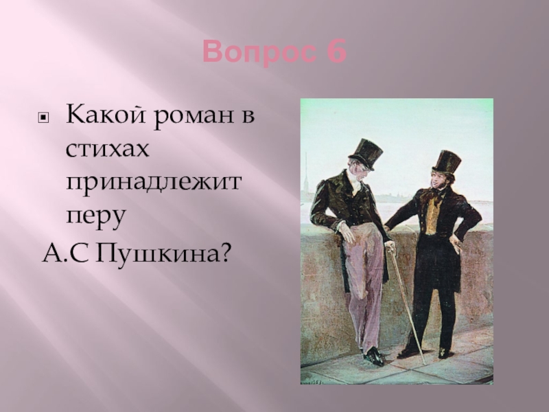Вопрос 6Какой роман в стихах принадлежит перу А.С Пушкина?