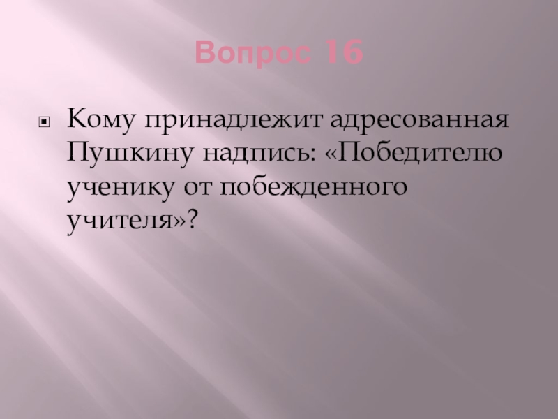 Вопрос 16Кому принадлежит адресованная Пушкину надпись: «Победителю ученику от побежденного учителя»?