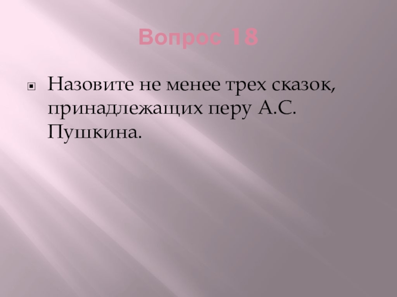 Вопрос 18Назовите не менее трех сказок, принадлежащих перу А.С. Пушкина.