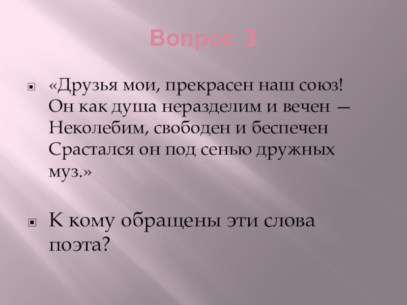 Вопрос 3«Друзья мои, прекрасен наш союз! Он как душа неразделим и вечен — Неколебим, свободен и беспечен