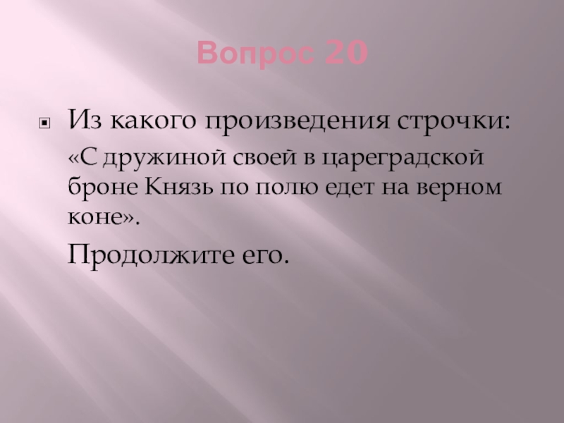 Вопрос 20Из какого произведения строчки:  «С дружиной своей в цареградской броне Князь по полю едет на