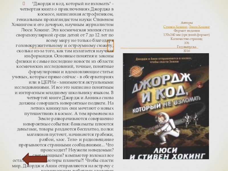 который не взломать" - четвертая книга о приключениях Джорджа в космосе, написанная астрофизиком, гениальным пропагандистом науки Стивеном Хокингом и его дочерью, научным журналистом Люси Хокинг. Эта космическая эпопея стала сверхпопулярной среди детей от 7 до 12 лет по всему миру не только благодаря головокружительному и остроумному сюжету, сколько из-за того, как там излагается научная информация. Основные понятия и законы физики и самые последние новости из области космических исследований, точные, понятные формулировки и вдохновляющие статьи ученых, которые прямо сейчас - в обсерваториях или в ЦЕРНе - занимаются актуальными исследованиями. И все это написано понятным и интересным младшему школьнику языком. В четвертой книге Джордж и Анника снова должны совершить невероятные подвиги. На летних каникулах они мечтают о новых путешествиях в космос. А тем временем на Земле разворачиваются совершенно невероятные события: банкоматы плюются деньгами, товары раздаются бесплатно, полки магазинов пустеют, начинаются грабежи, разбои, хаос. Теле- и радиовещание прерываются странными сообщениями... Что происходит? Неужели неведомыи? сверхмощныи? компьютер взломал все остальные компьютеры планеты?! Чтобы спасти мир, Джордж и Анни отправляются на встречу с космическими роботами-злодеями