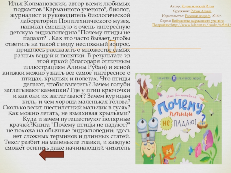 любимых подкастов "Карманного ученого", биолог, журналист и руководитель биологической лаборатории Политехнического музея, написал смешную и очень интересную детскую энциклопедию "Почему птицы не падают?". Как это часто бывает, чтобы ответить на такой с виду несложный вопрос, пришлось рассказать о множестве самых разных вещей и понятий. В результате из этой яркой (благодаря отличным иллюстрациям Алины Рубан) и ясной книжки можно узнать все самое интересное о птицах, крыльях и полетах. Что птицы делают, чтобы взлететь? Зачем голуби заглатывают камешки? Где у птиц крючочки и как они их застегивают? Зачем курицам киль, и чем хороша маленькая голова? Сколько весит шестилетний мальчик в гусях? Как можно летать, не взмахивая крыльями? Куда и зачем путешествуют полярные крачки?Книга "Почему птицы не падают?" не похожа на обычные энциклопедии: здесь нет сложных терминов и длинных статей. Текст разбит на маленькие главки, и каждую сможет осилить даже начинающий читатель