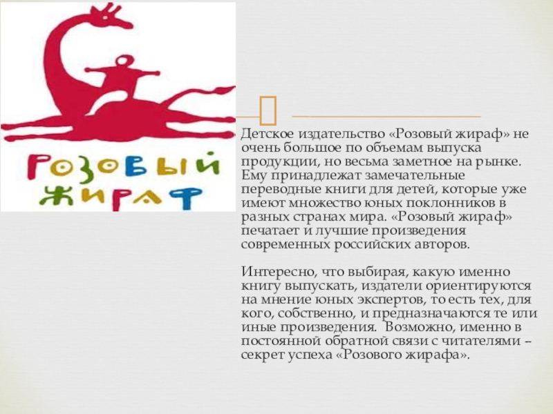 Слайд 3Детское издательство «Розовый жираф» не очень большое по объемам выпуска продукции,