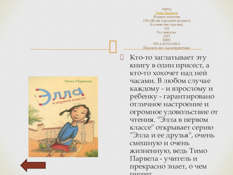 эту книгу в один присест, а кто-то хохочет над ней часами. В любом случае каждому - и взрослому и ребенку - гарантировано отличное настроение и огромное удовольствие от чтения. "Элла в первом классе" открывает серию "Элла и ее друзья", очень смешную и очень жизненную, ведь Тимо Парвела - учитель и прекрасно знает, о чем пишет.